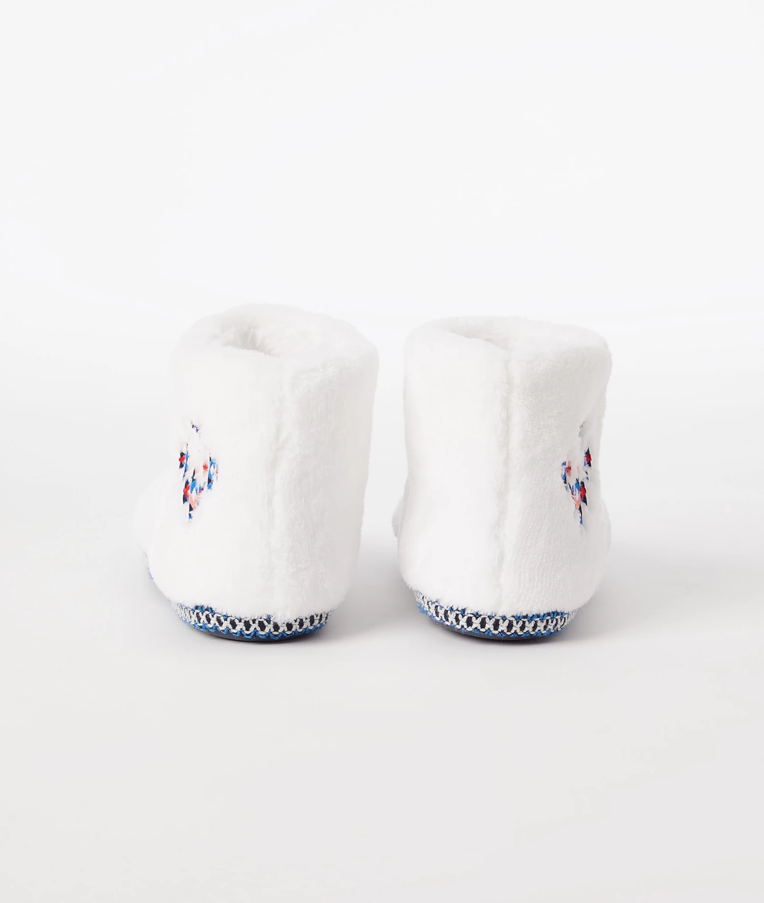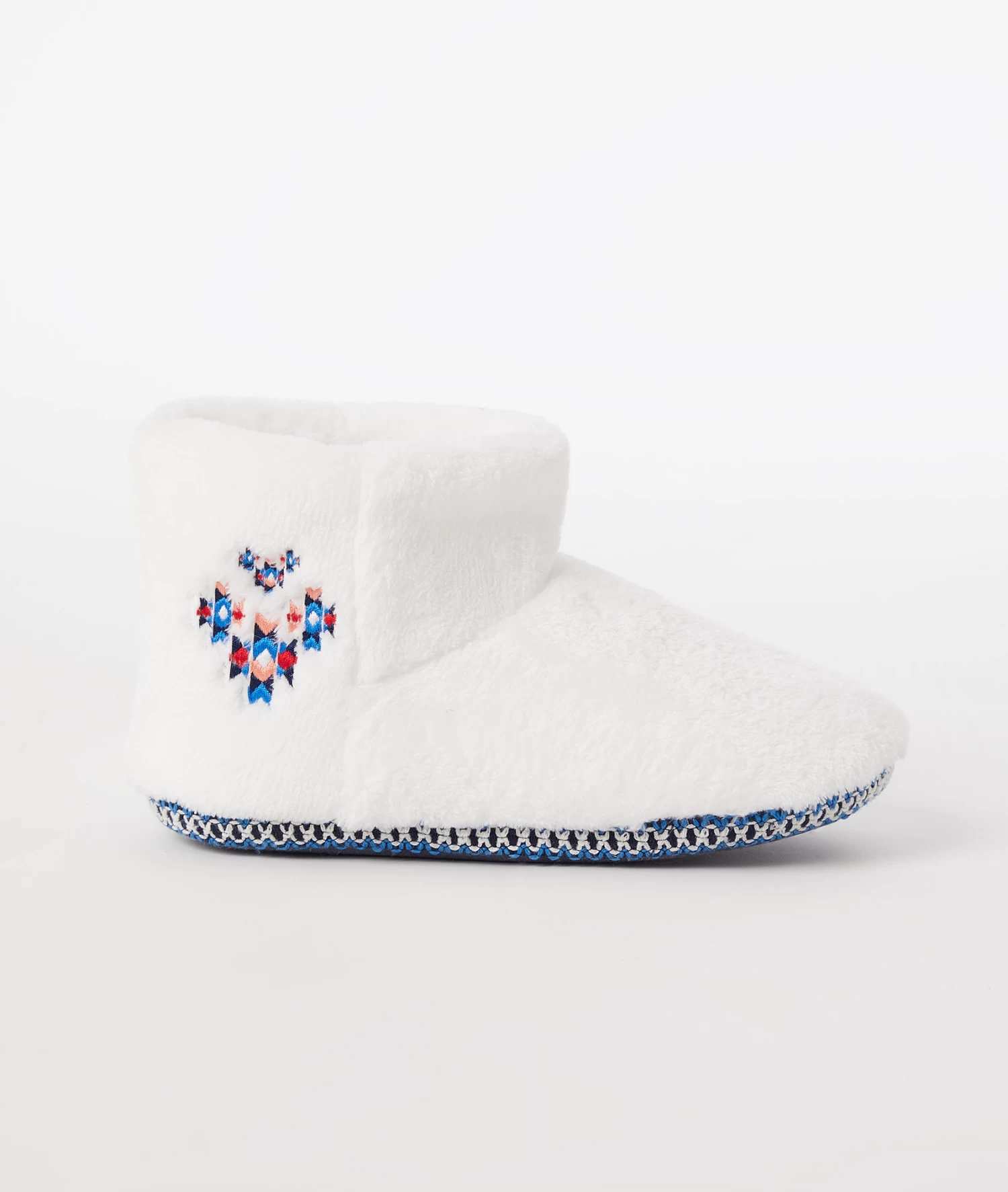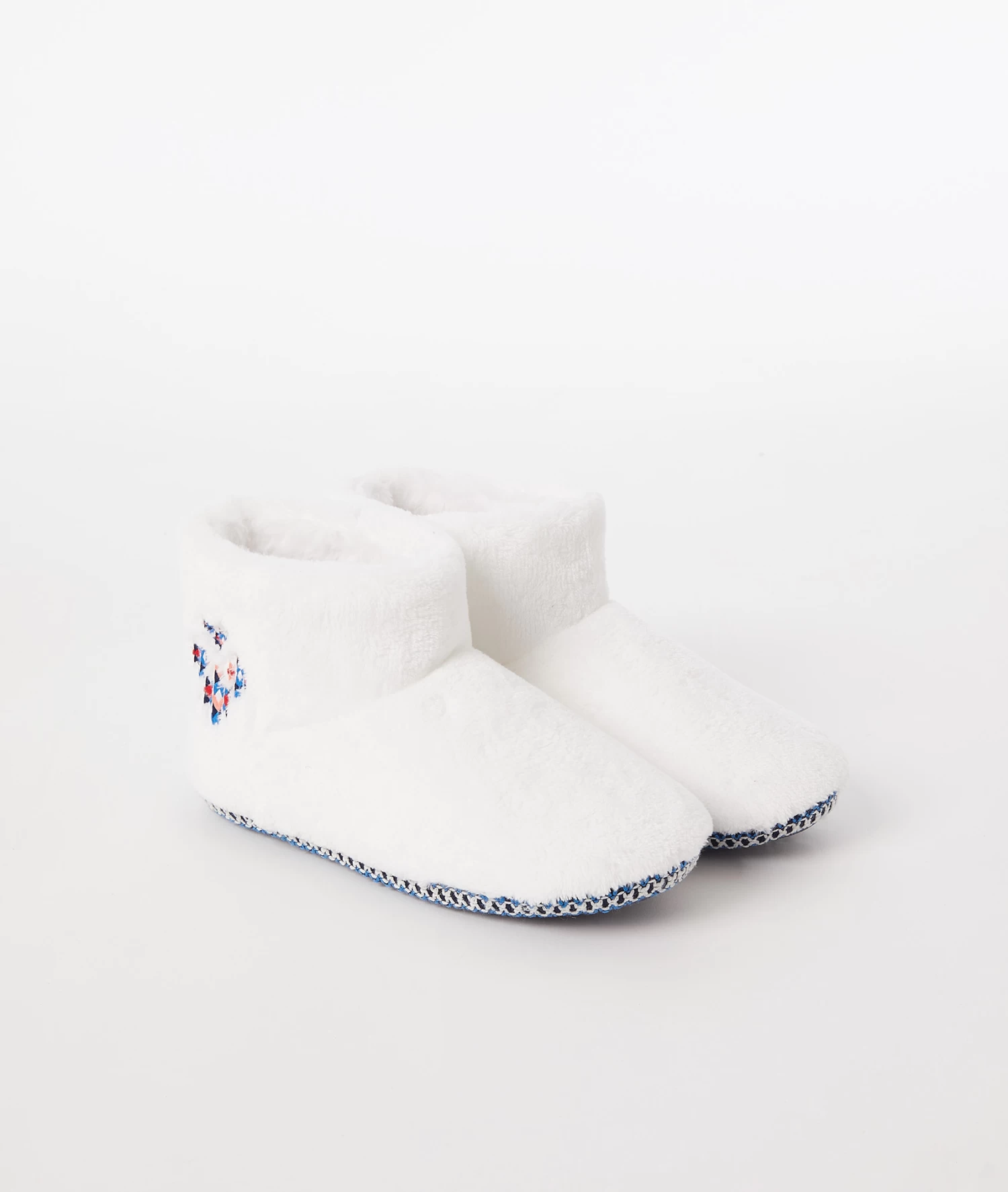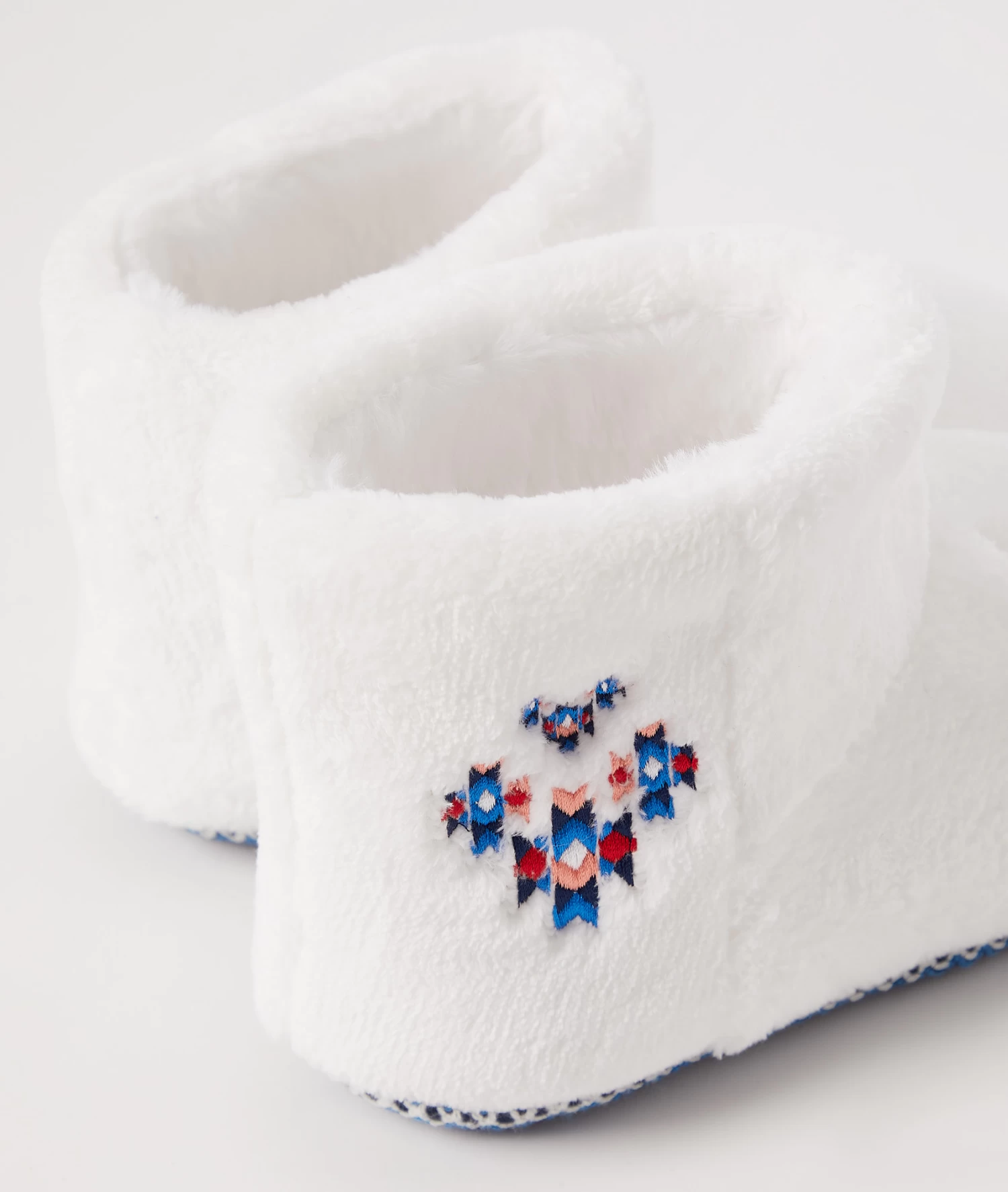 Complétez vos looks de nuit avec ces chaussons bottines en fausse fourrure, délicatement brodés d’un motif coloré sur le côté.