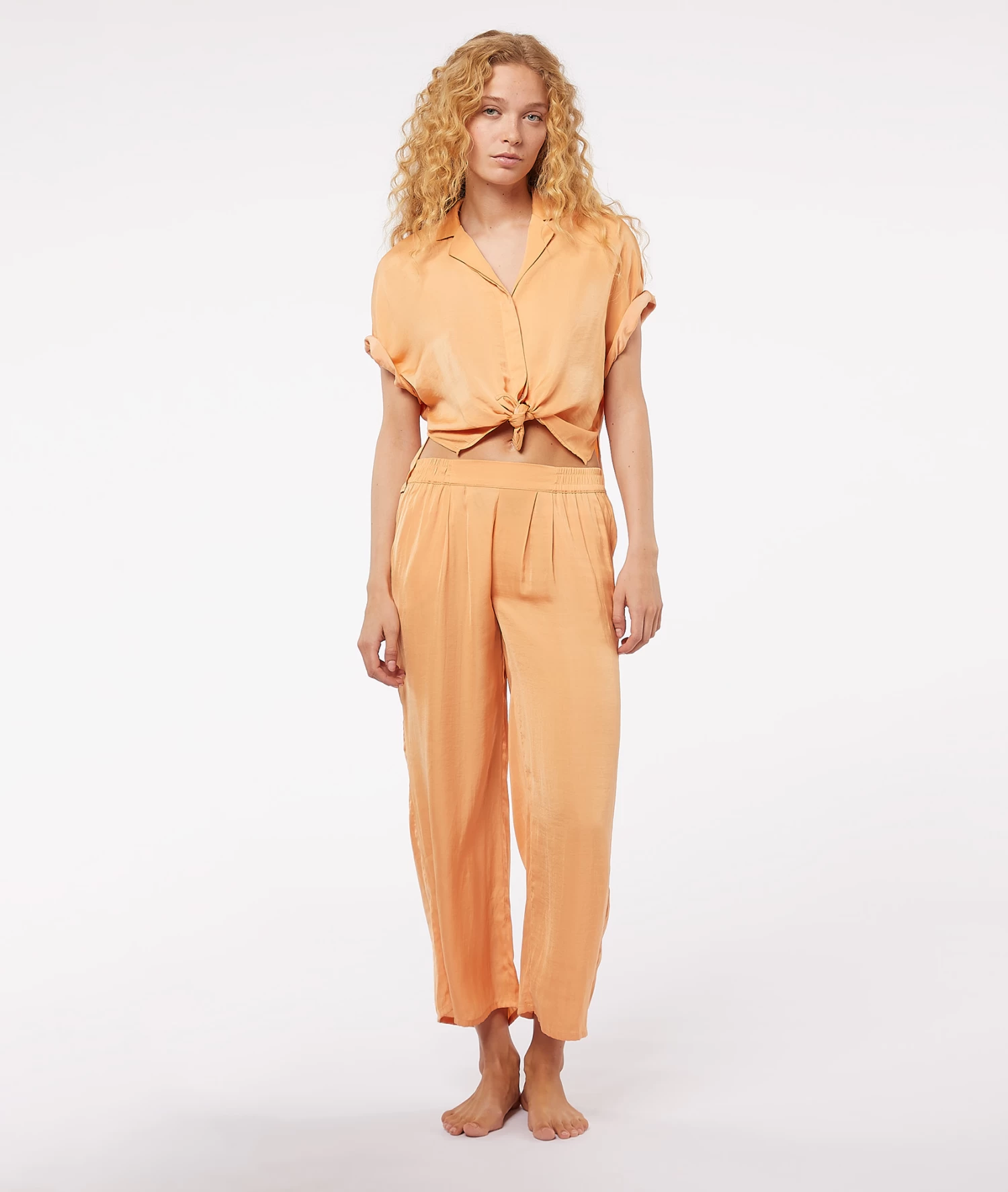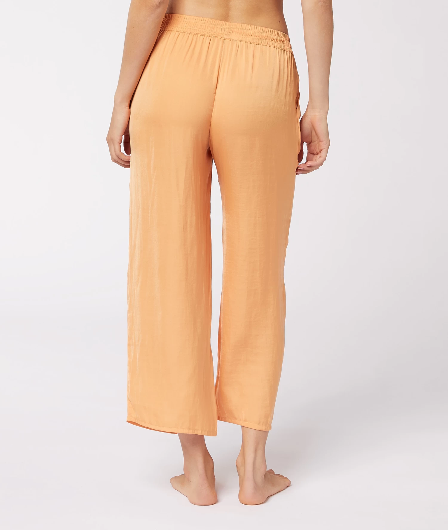 Fluide et léger, ce pantalon satiné muni d’une taille smockée est idéal pour un cocooning chic en douceur.