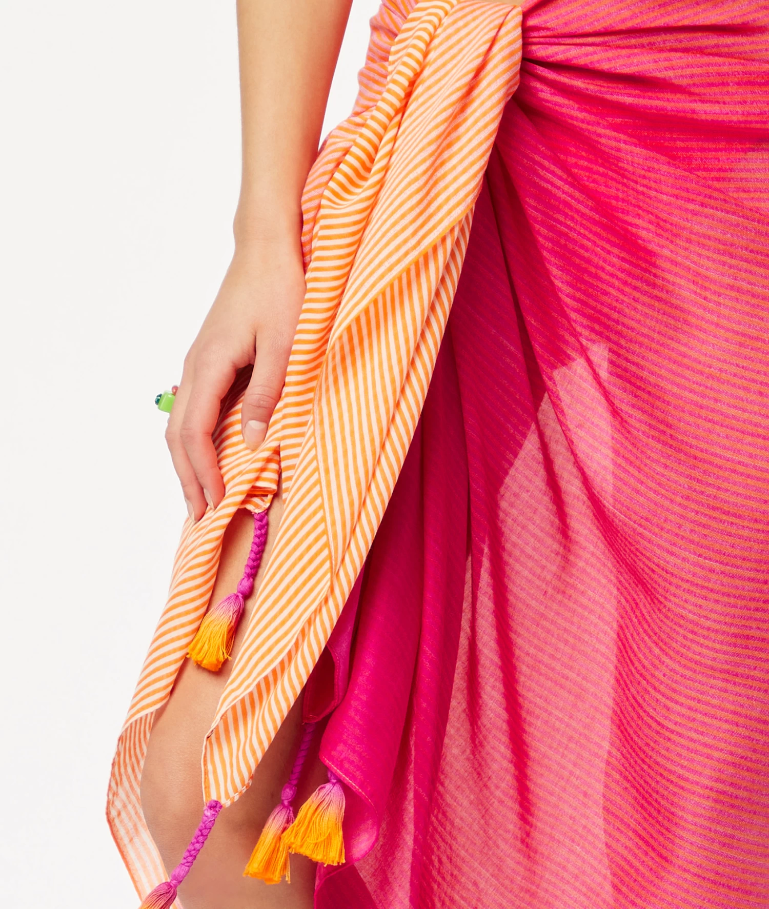 Laissez vous séduire par ce paréo de plage qui dévoile un sublime dégradé au colorama d’un coucher de soleil. Long, il se porte à la taille ou autour du coup selon vos envies.