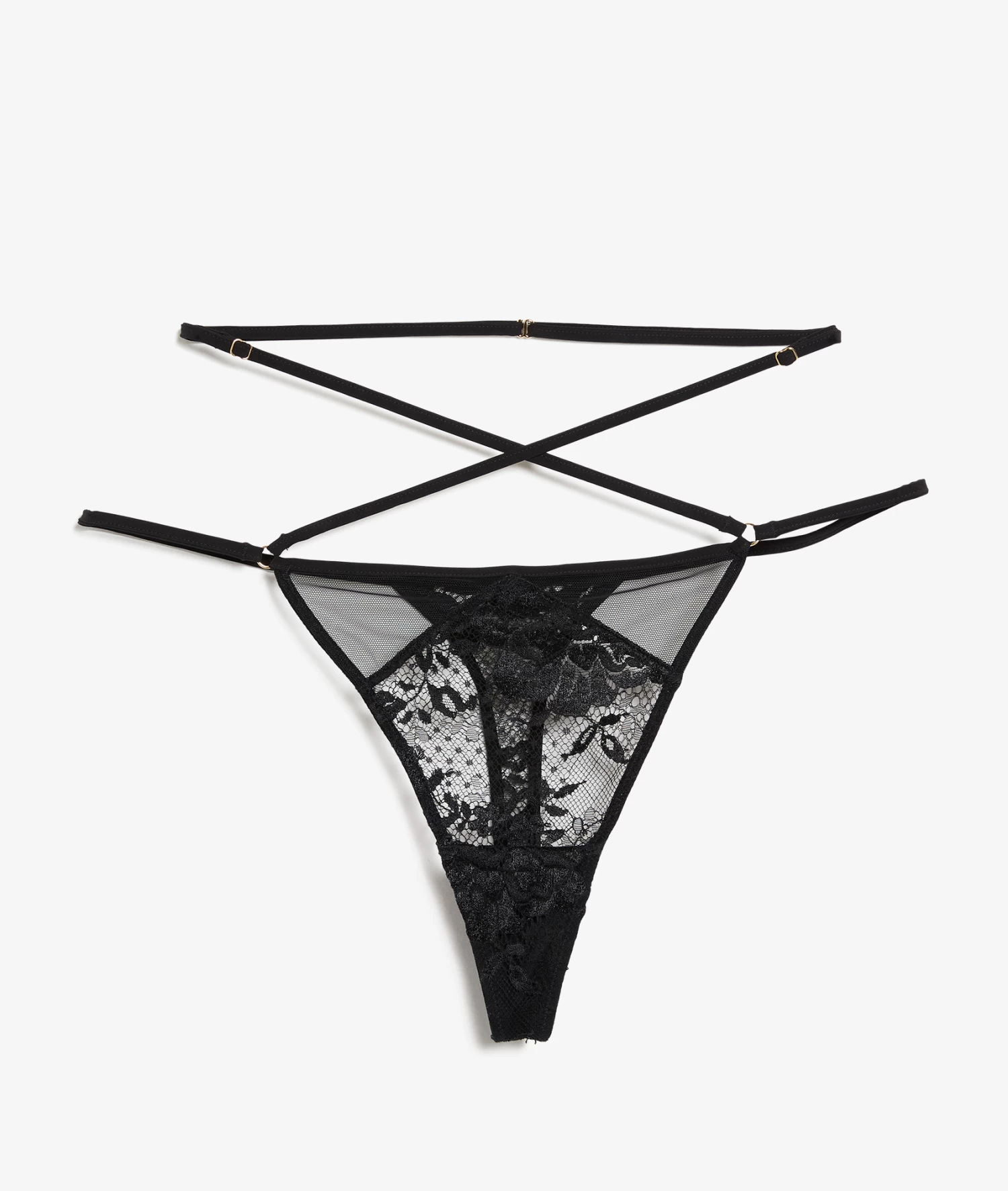Des liens sensuels entourent le cou et une dentelle française d’exception signée Noyon, dévoile la peau : ce string sexy est une pièce de lingerie couture et sophistiquée à adopter avec le soutien-gorge coordonné.
